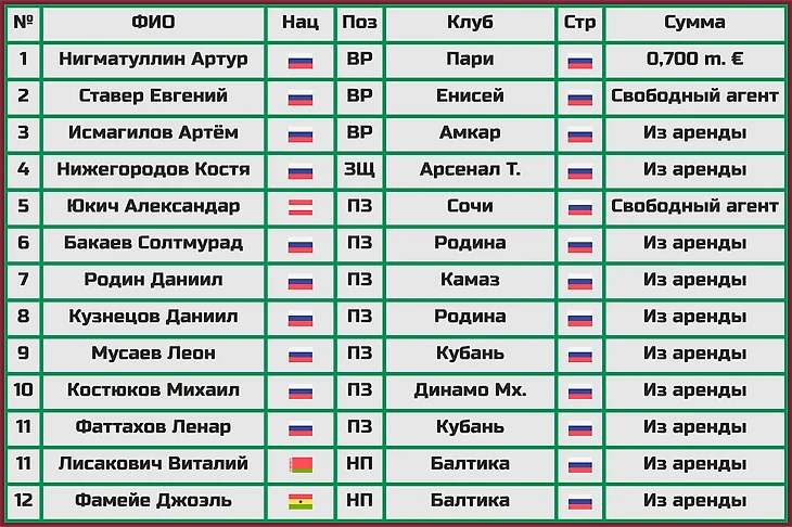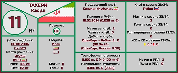 Помимо этого есть еще и совсем молодые иранец Касра Тахери и россиянин Даниил Моторин, но они (если никто из пары Лисакович - Фамейе все же не уйдёт до закрытия трансферного окна) скорее всего будут по большей части сидеть на скамейке запасных или играть за «Рубин-2».