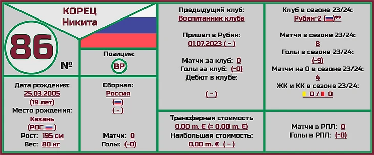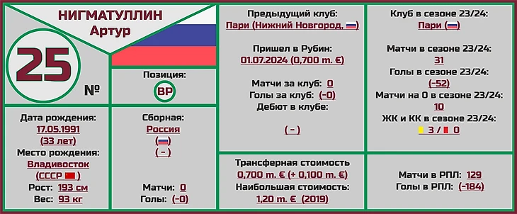 Как уже было написано выше, казанский «Рубин» перед стартом этого сезона остался без своего основного голкипера Юрия Дюпина (игрок решил не продлевать с казанцами истекающий контракт и отправился в «Краснодар»), и на его место был приглашен хорошо зарекомендовавший себя по играм за нижегородский клуб «Пари» Артур Нигматуллин.