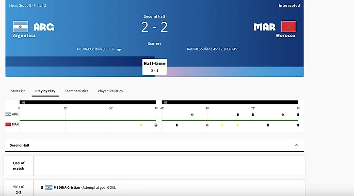 Официальный сайт Олимпиады через час с лишним после инцидента противоречил сам себе: у матча был статус Interrupted («прерван»), при этом среди событий значилось End of the match сразу после второго аргентинского гола.