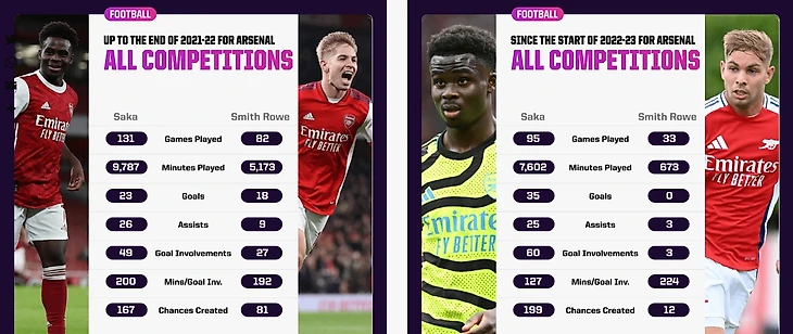 Это не совсем справедливое сравнение потому что очевидно что Сака всегда был лучшим игроком а Смит Роу возможно не когда не будет близок не подошел бы к тому, чтобы подражать Скоулзу, Бэйлу, Рэмси или Окслейд-Чемберлену), но его взлет только подчеркивает то, что могло бы быть.Сравнение показателей его команды и Сака до и после окончания сезона 2021-22 показывает, насколько резко разошлись их карьеры.