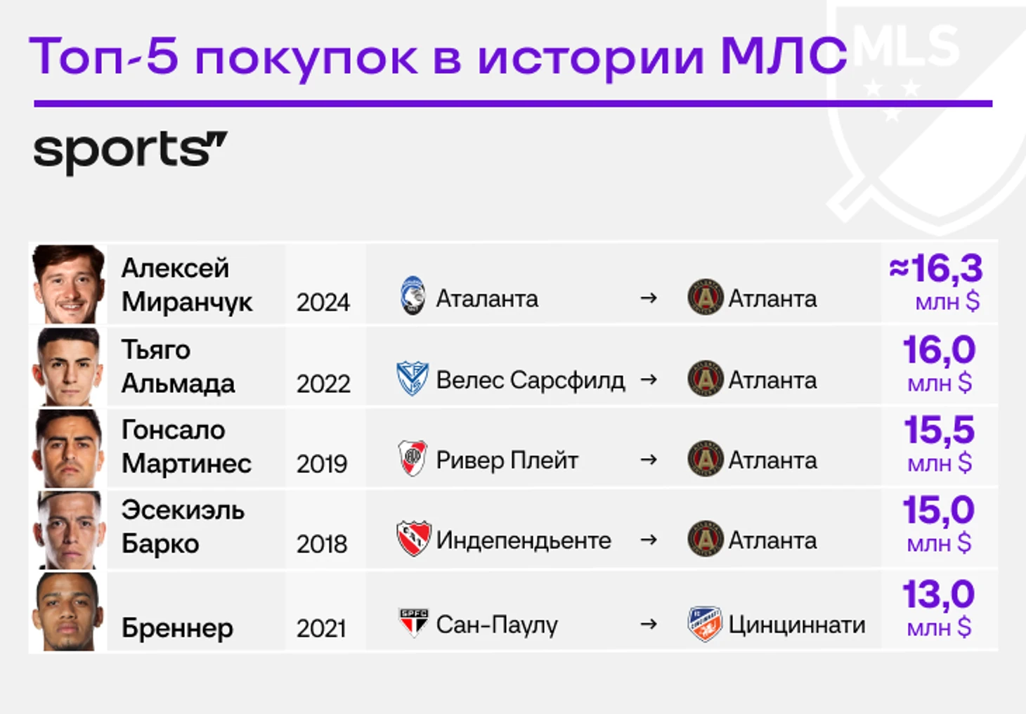 Три предыдущих рекорда тоже за «Атлантой» – все связаны с трансферами из Аргентины, в том числе свежий новичок «Спартака» Эсекиэль Барко. Вообще, клуб позиционирует себя как трамплин для талантливых южноамериканцев в Европу. Лучший пример – парагваец Мигель Альмирон, который уехал в «Ньюкасл» за рекордные для МЛС 27 млн долларов.