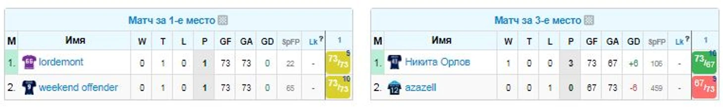 Основное время финала закончилось вничью 73:73, по дополнительным показателям (учитывалось общее количество, набранное в ходе плей офф ЛЧ) победу одержал lordemont со счетом 475:466, он и становится победителем турнира. Мои поздравления победителю.