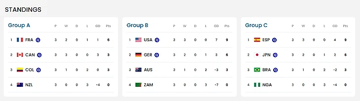 Положения в группах и сетка плей-офф после третьего тура женского олимпийского футбольного турнира-2024: