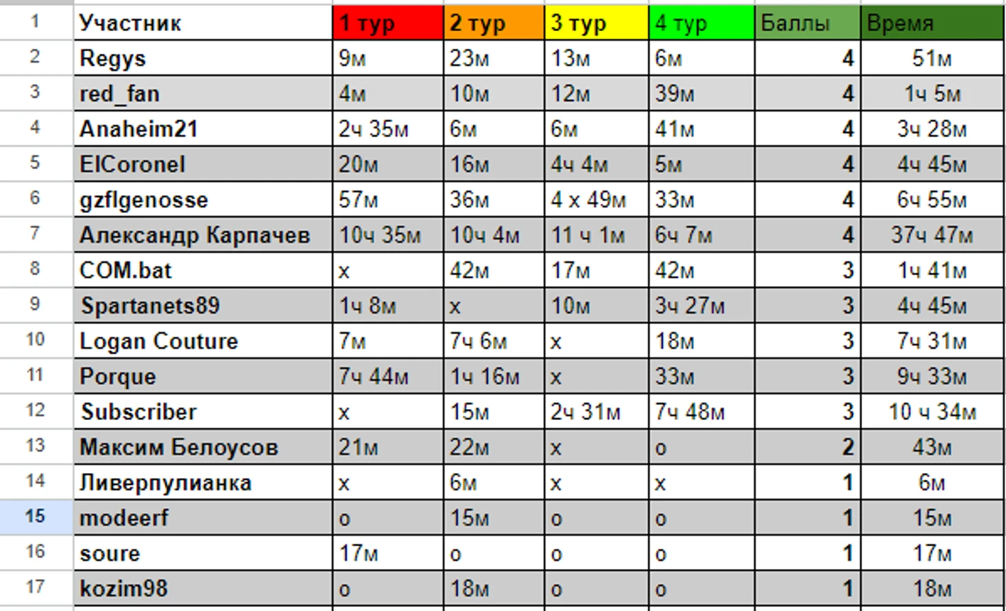 И самое забавное что разбор четвертого вопроса я писал минут минут десять, а наши участники отвечали на него раза в два быстрее. Первым правильную логику нащупал стремительный ElCoronel, всего минутку ему уступил Regys. Ну а бронза в этом туре досталась Logan Couture.