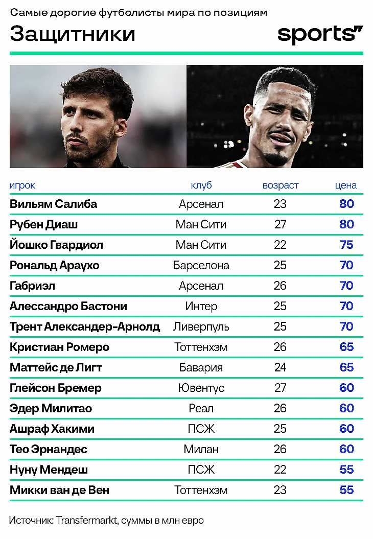 ● Сразу четыре клуба представлены парами: Хакими-Мендеш («ПСЖ»), Ван де Вен-Ромеро («Тоттенхэм»), Салиба-Габриэл («Арсенал») и Диаш-Гвардиол («Ман Сити»).