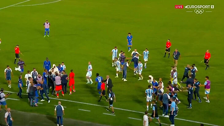 В четвертьфинале футбольного турнира Олимпиады Франции обыграла Аргентину со счетом 1:0. Матч получился жаркий, но по-настоящему вспыхнуло только после финального свистка: на поле началась потасовка с участием обеих команд.