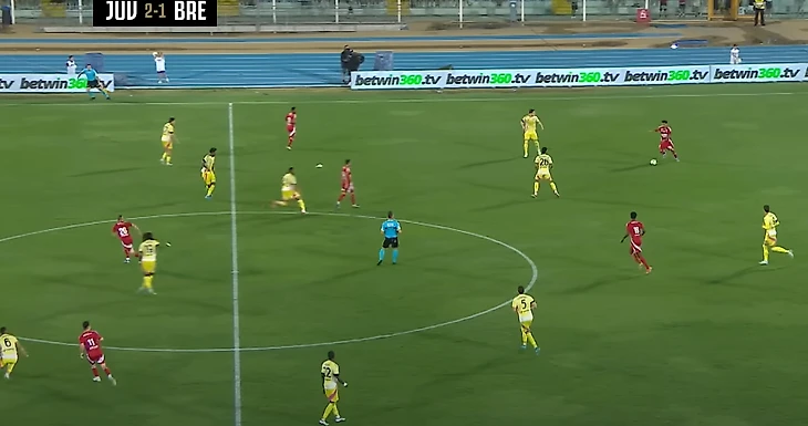 5. – Локателли, получая мяч от Дугласа Луиса, переводит его на противоположный фланг, где Йылдыз врывается на свободное пространство, к сожалению, пас у Мануэля не получился.