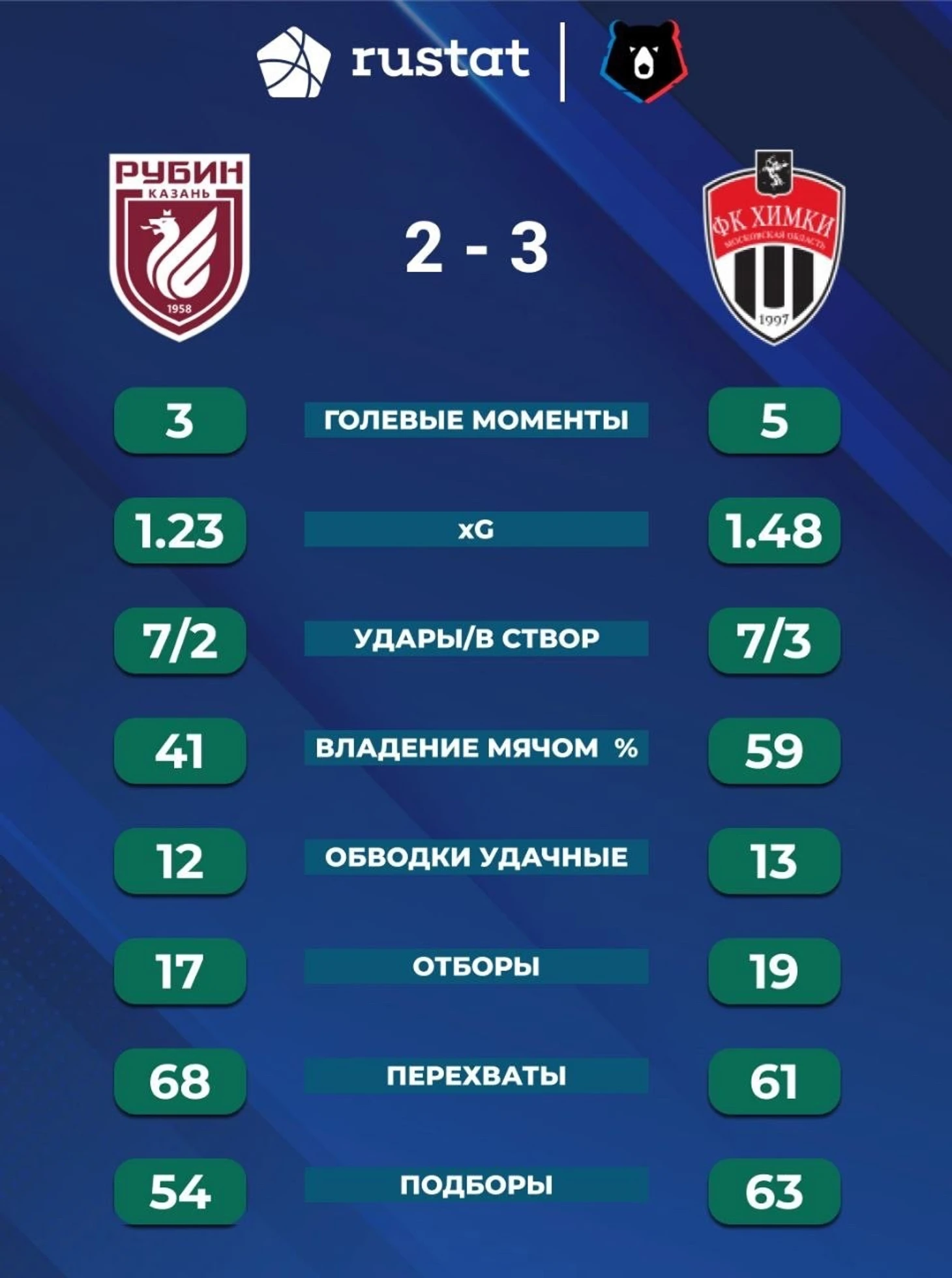 — «Химки» продлили серию побед над «Рубином» до 6 матчей. Последний раз «Рубин» выигрывал подмосковную команду в 2018 году.