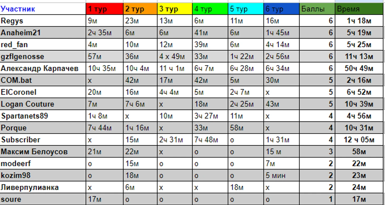 Что касается тройки лидеров, то здесь произошли тектонические сдвиги: red_fan сильно запоздал с ответом на шестой вопрос и не только дал уйти в отрыв Regys, но и пропустил вперед себя коварного Anaheim21. Впрочем расстояние между вторым и третьим местом всего шесть минут, так что напряженно всматриваемся в эту мощнейшую зарубу в финишном створе..