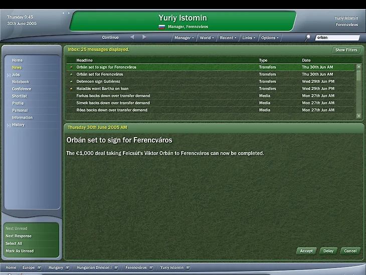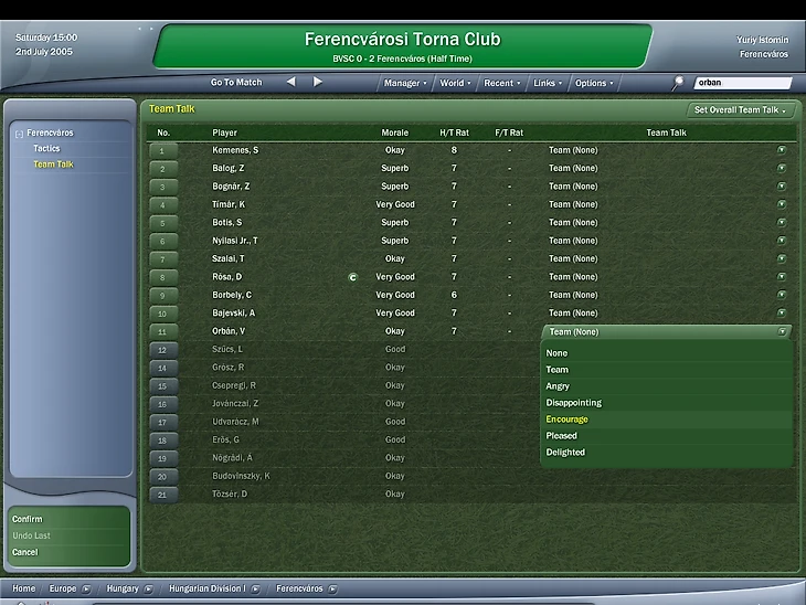 Естественно, нужно очень много терпения, чтобы полноценно отыграть в FM весь сезон. Да еще и в малознакомом чемпионате Венгрии. Так что уходим в отпуск на год, а все полномочия делегируем помощнику. Даем наставление – никого не продавать, а Орбана выпускать в каждом матче (если он, конечно, здоров).