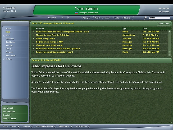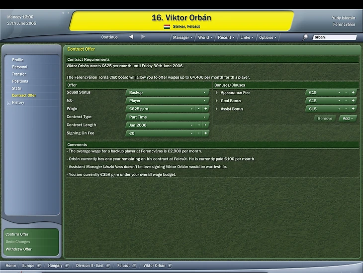 Итак, создаем профиль и назначаем себя в «Ференцварош». С одной стороны, Орбан никогда не скрывал симпатий к столичному клубу. С другой, команда в середине нулевых переживала не лучшие времена. В 2005-м стала второй (впервые в истории победил «Дебрецен»), но через год, несмотря на шестую строчку, лишилась места в элите из-за финансовых проблем. В высшую лигу «Ференцварош» вернулся лишь в 2008-м, а золото выиграл в 2016-м. Возможно, в нашем случае Орбан убережет клуб от позорного вылета.