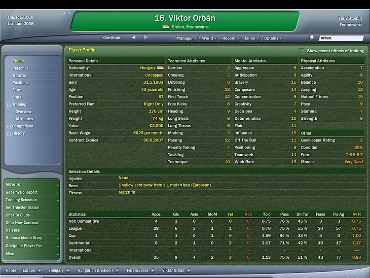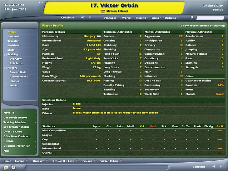 Раз мы точно не знаем, каким футболистом был реальный Орбан, обратимся к виртуальному. Политик-нападающий есть только в Football Manager 2006 (она вышла осенью 2005-го). В FM-2005 его нет. То, что это именно он, сомнений быть не может: дата рождения и приблизительный рост совпадают. Разве что зарплата (60 евро в месяц), скорее всего, вымышленная. Рабочая нога – правая. Тренировочной практики на старте игры ему не хватает.