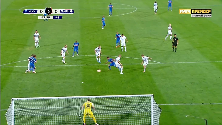 48-я минута – нападающий Сердер Сердеров упал в штрафной «Пари НН» после стыка с защитником Кириллом Гоцуком. Свистка нет, сигнала от ВАР – тоже.
