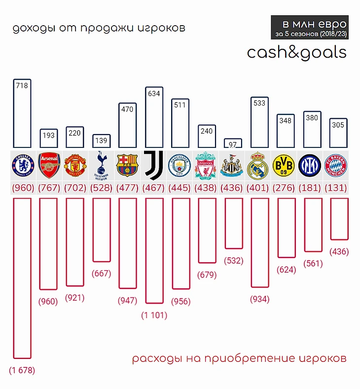 Манчестер Юнайтед, Тоттенхэм, Арсенал, Манчестер Сити и Ливерпуль генерируют большой операционный доход, который утилизируется в большие трансферы, что в последующем ведет к большой амортизации. И им не нужно продавать своих воспитанников, чтобы сводить концы с концами в финансовой отчетности. Челси имеет операционный убыток, но тратит на трансферы больше всех. Больше всех в мире! Об этом тоже уже писал здесь, приведу графика из прошлого материала (суммы в евро, поэтому отличаются от указанных выше):