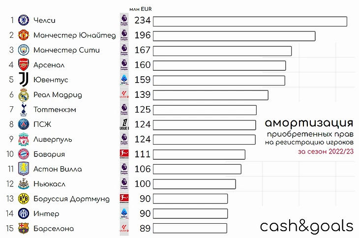сумма годовой амортизации затрат на приобретение игроков клубов большой шестерки АПЛ в сезоне 2022/23: Челси 203,3 млн фунтов, Манчестер Юнайтед 170,2 млн, Манчестер Сити 145,4 млн, Арсенал 139,1 млн, Тоттенхэм 108,6 млн, Ливерпуль 107,5 млн.