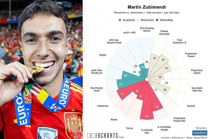Испанские медиа так и пишут: «Субименди — игрок аккуратный, с мячом не возится, отдаёт, когда надо, и любит сам сам продвигает мяч вперед.» Понимает, когда отойти назад, а когда — поддержать атаку. По данным WhoScored, он больше всех контролировал мяч в третьей зоне полузащиты за весь прошлый сезон Ла Лиги. Это значит, что парень умеет держать игру под контролем, а в футболе Слота футболе это качество первостепенное.