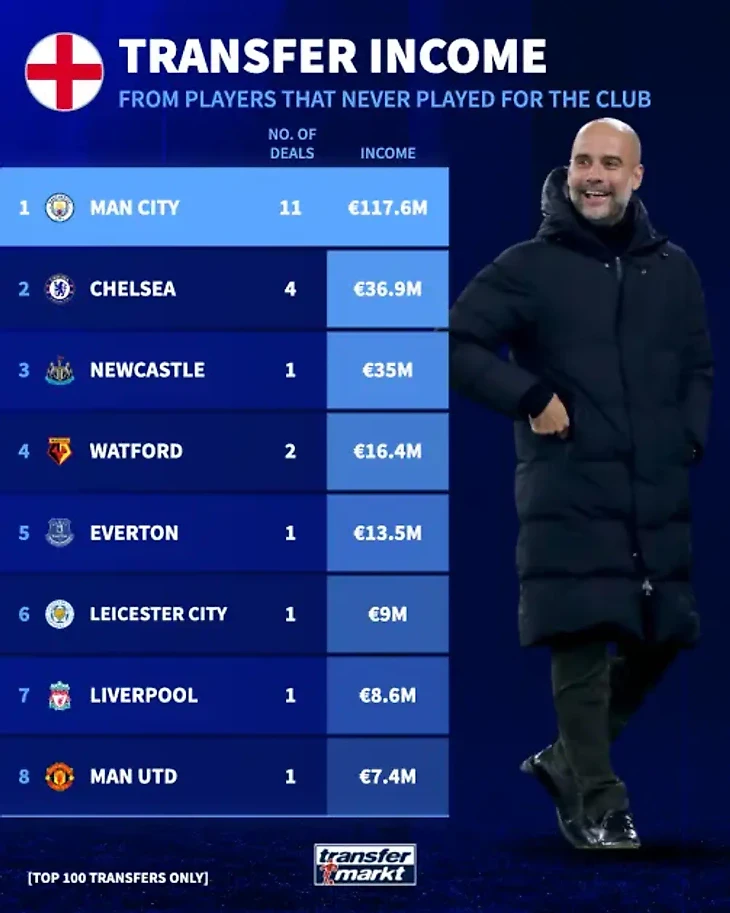 Самый ожидаемый клуб в этом рейтинге – «Челси», заработавший 36,9 млн евро на трансферах таких игроков, как Патрик Бэмфорд, Кристиан Атсу, Торган Азар и Марио Пашалич. Это ставит их на второе место среди английских клубов по таким особенным трансферам, чуть выше «Ньюкасла». Но есть высокая вероятность, что скоро лондонцы будут на первом.