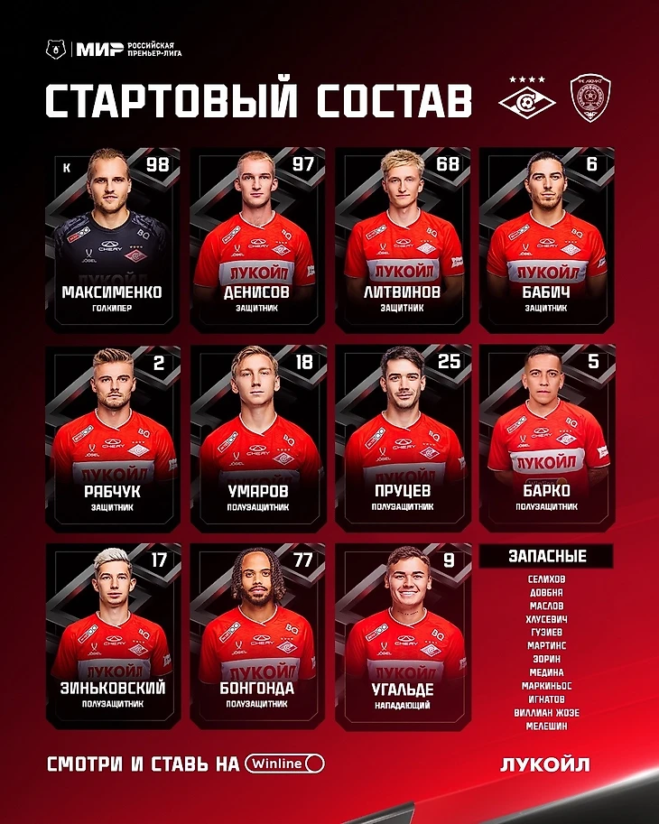 Запасные: Селихов, Довбня, Маслов, Хлусевич, Гузиев, Мартинс, Зорин, Медина, Маркиньос, Игнатов, Виллиан, Мелешин.
