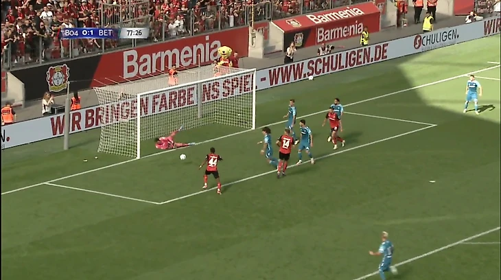 А вот на 77-й минуте команда Хаби Алонсо наконец то смогла сравнять счёт. Снова через правый фланг и снова через Фримпонга, навесившего на Патрика Шика, который пробил по воротам «Реал Бетиса». Руй Силва парировал удар чеха.