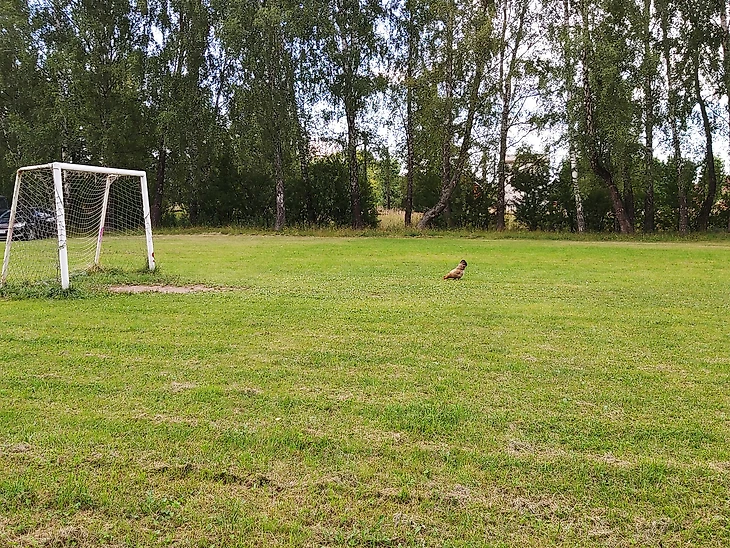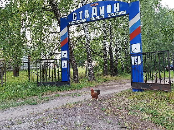 У стадиона вольно бегают курицы. Примечательно, что бегали они и на маленьком футбольном поле, расположенном рядом с большим футбольным полем. В перемещениях по территории стадиона их никто не ограничивал и пресловутый паспорт болельщика не спрашивал. Для полноценного пейзажа не хватало разве что пасущейся где-то в районе углового флажка коровы.