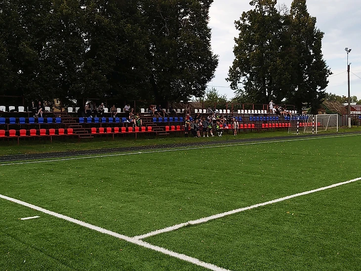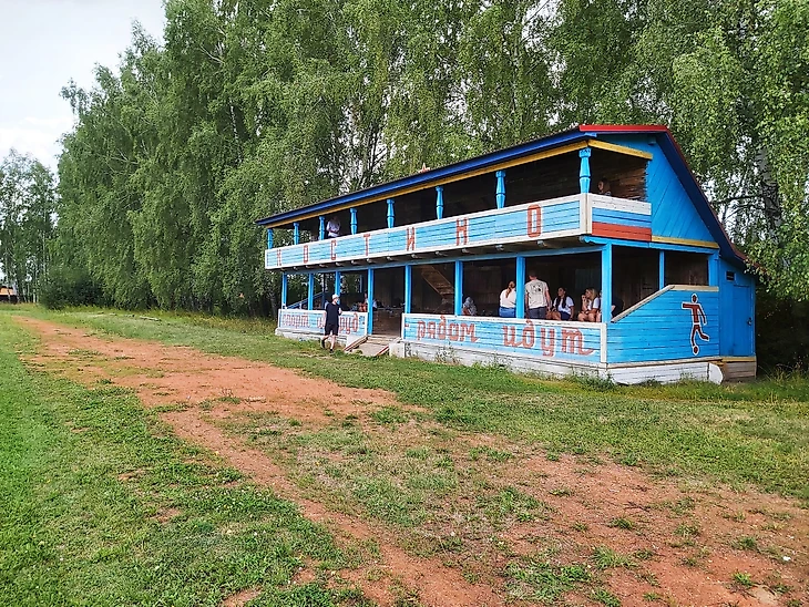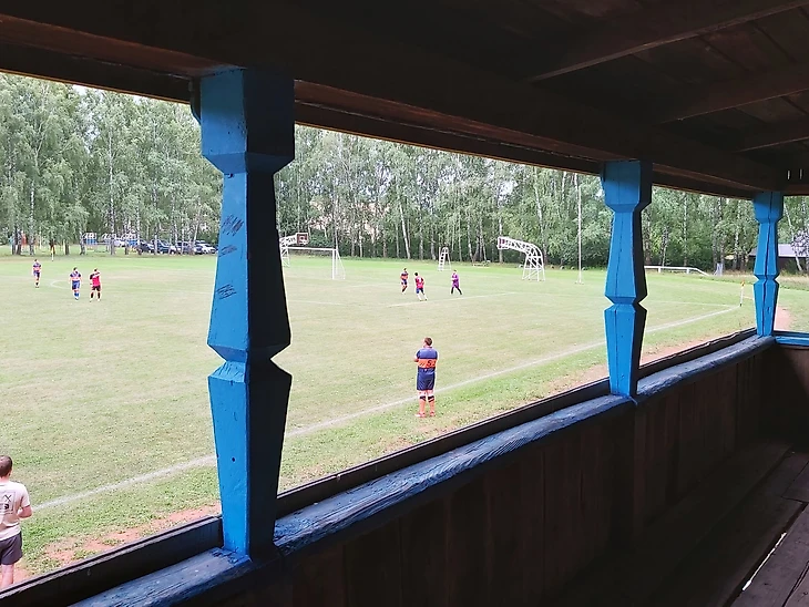 Деревянная трибуна представляет собой двухярусное сооружение и вызывает ассоциацию с речным пароходом. Хотя ассоциации могут быть и другими. Сегодня первый ярус служит не только местом сосредоточения немногочисленных зрителей, но и раздевалкой для игроков «Житово». Хозяева же переодевались в отдельном помещении, что выглядело не совсем гостеприимно. Но это совсем не означало, что отдельного помещения не было предусмотрено и для гостей. Возможно, у игроков из Житово просто не было в этом помещении необходимости.
