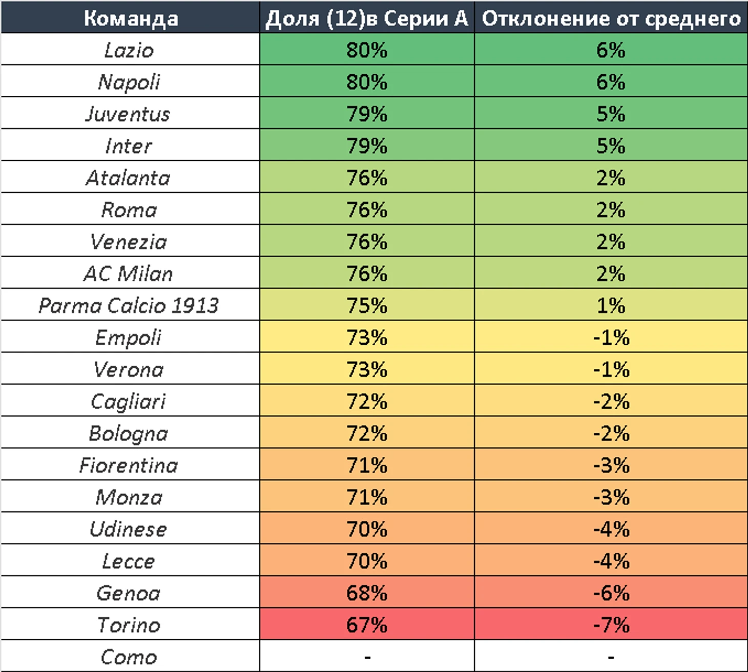 Разбирая команды, которые играются на ставку (12), можно увидеть следующие показатели.