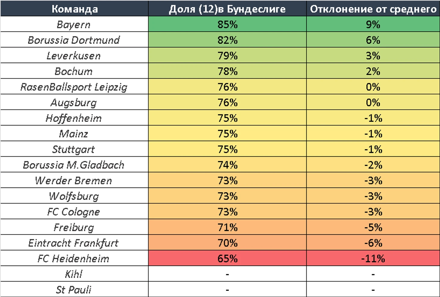 Новички сезона Киль и Санкт-Паули давно не играли в высшем дивизионе и я по ним статистику набить не смог. Хайденхайм сырал всего 1 сезон в Бундеслиге и его отклонение в 11% мне понятно, слишком маленькая выборка для статистики, потому его в любом случае брать не буду в свои экспрессы. Расстроило то, что в лидерах по ставке (12) идут все фавориты, чего не скажешь по Англию. Высокие кэфы на этих командах не поднять. По Бундеслиге буду брать команды с показателями от Баварии до Штутгарта.