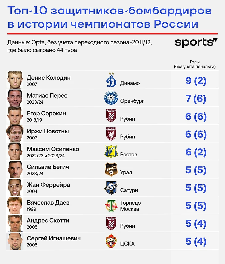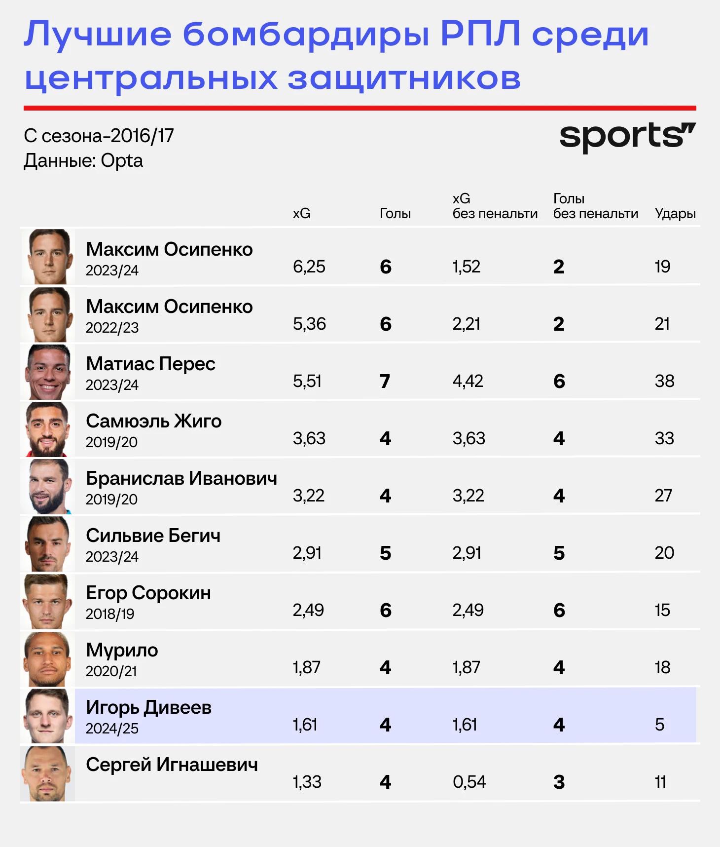 Без учета одиннадцатиметровых выделяются Матиас Перес, Егор Сорокин и Иржи Новотны – все забили по шесть. Дивеев совсем рядом, но другим центральным защитникам понадобился целый сезон, а Игорю хватило четырех туров.