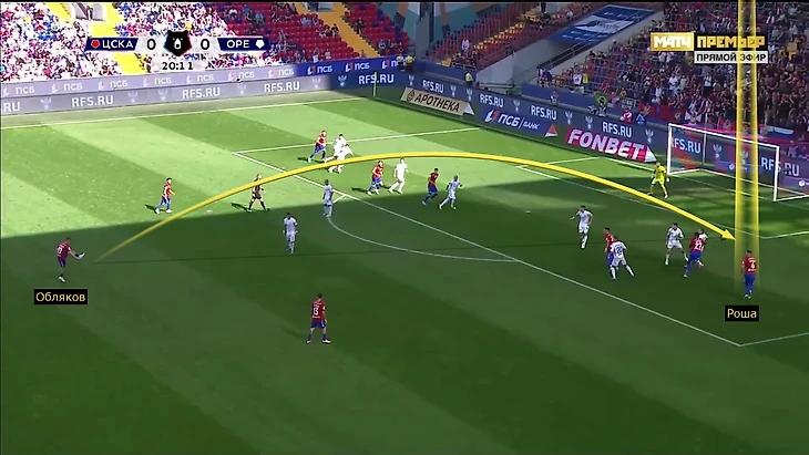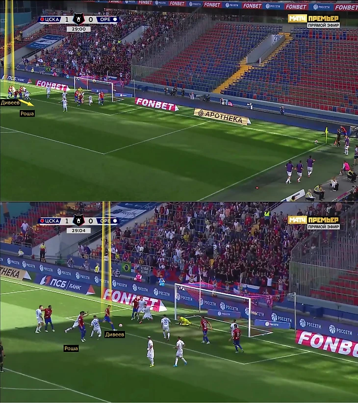 ЦСКА аналогично расставился и против «Оренбурга», но роли Роши и Дивеева отличались: Виллиан реагировал на подачу Облякова на линии вратарской, а Игорь остался на дальней штанге – вратарь Николай Сысуев неудачно отбил, а Мохаммад Горбани – прямой оппонент Дивеева – проворонил добивание.