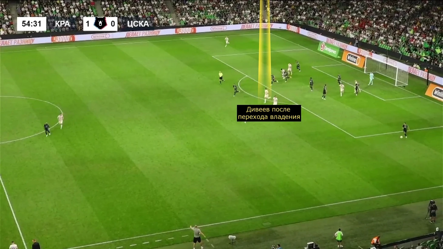 Обляков подал в центр вратарской: Дивеев пролетел мимо мяча и не успевал назад. Когда ЦСКА прервал выпад, Игорь еще не вернулся из нападения. Его надежно подстраховали, поэтому доиграл до конца переход владения: добил «Краснодар» после опасных ударов Облякова и Секу Койты.