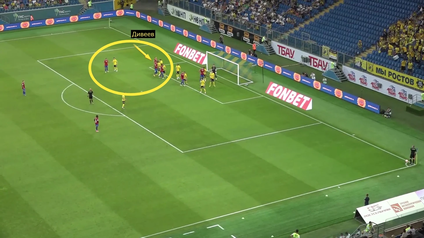 Во время гола «Оренбургу» ЦСКА использовал привычный кросс Роше на дальней штанге. Затем Дивеев просто заблокировал вынос Матиаса Переса после неожиданного удара Рифата Жемалетдинова через себя, что привело к голу.