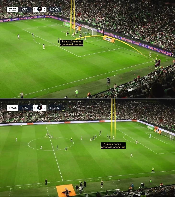 С «Краснодаром» Дивеев не добирался до подач. На первом стандарте моментально побежал назад: во время углового он располагался в середине и оказался неподалеку от мяча.