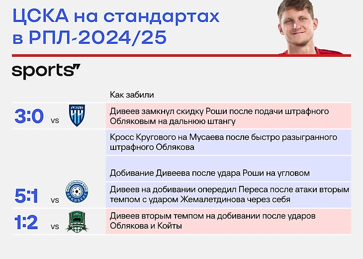 Результативность – бешеная. У Дивеева четыре гола пятью ударами, у ЦСКА три мяча со стандартов при пяти ударах (три после угловых и два после штрафных).