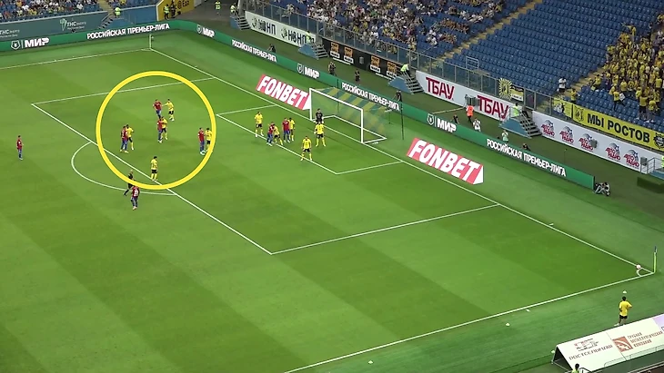 На втором угловом ЦСКА иначе расставился: оставил четверку за штрафной (в прошлом эпизоде контратаку страховали трое) и сгруппировался на дальней штанге.