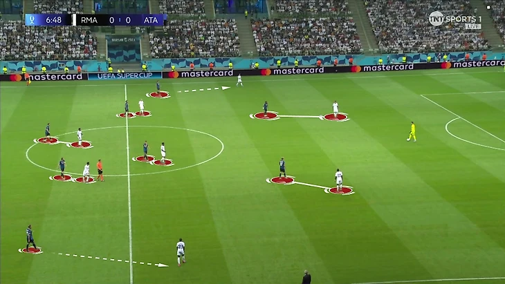 Во втором тайме Анчелотти умышленно сделал схему более открытой. Теперь в отдельных эпизодах «Реал» защищался в 4-2-4. Активное участие в процессе принимала только нижняя шестерка, атакующее трио и примкнувший к ним Джуд Беллингем оставались выше: