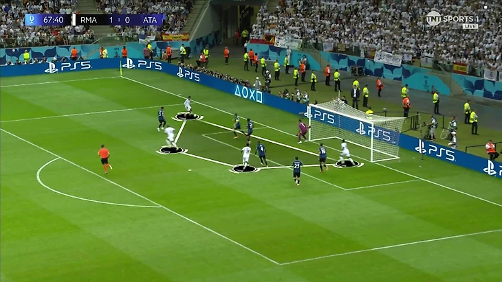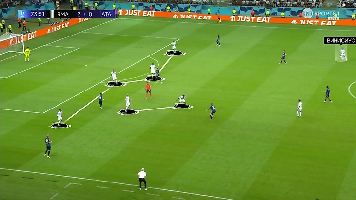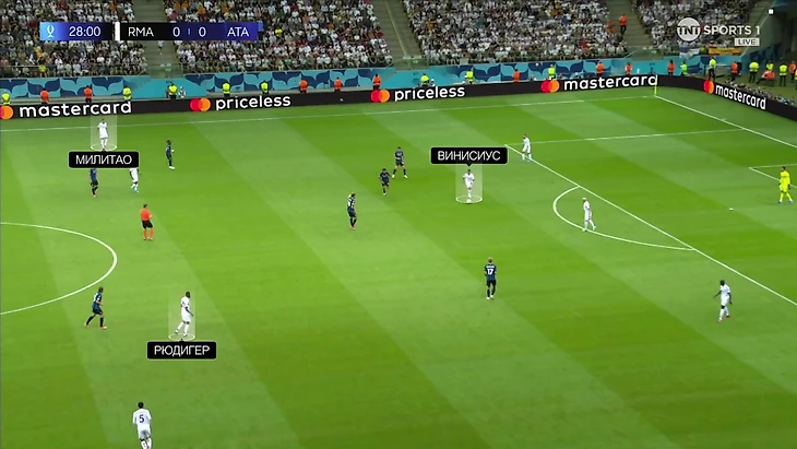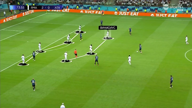 Тут центральные защитники снова неординарно высоко, а Винисиус решил проверить строгость персоналок «Аталанты» максимальным спуском: