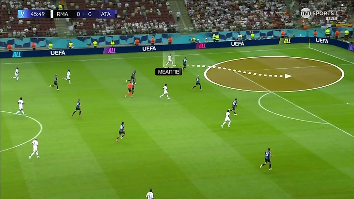Еще один фактор яркости Мбаппе – в матче стало больше игры на пространстве. В такие моменты Килиан не только блистал сам, но и помогал партнерам. Например, здесь увел оппонента левее, чтобы максимизировать пространство для открывания Вини: