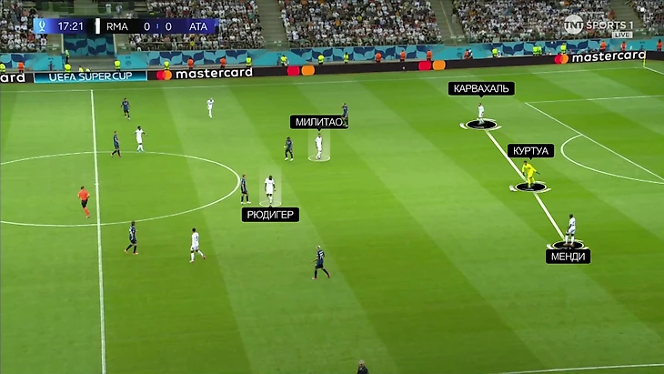 Здесь тоже максимально освободили плеймейкера Куртуа, а рывок под открывание в атаку делал Рюдигер: