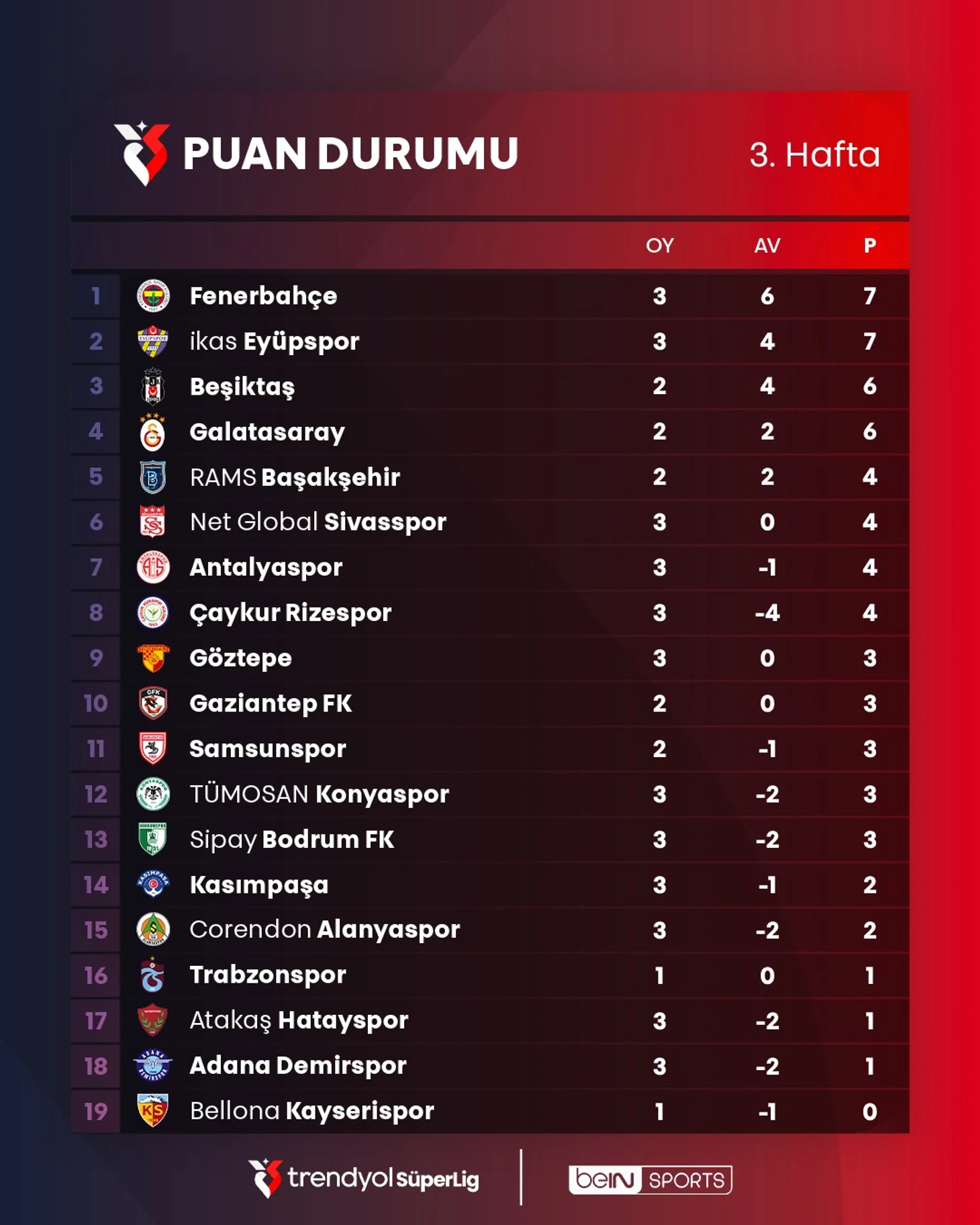 3-й тур Супер Лиги получился коротким: «Бешикташ» пропускал его по плану, а «Галатасарай», «Трабзонспор» и «Истанбул Башакшехир» в связи с решением TFF, разрешившей командам, принимающим участие в квалификации к еврокубкам, отдохнуть. Их матчи будут сыграны в сентябре.