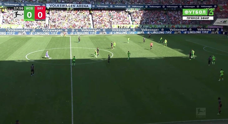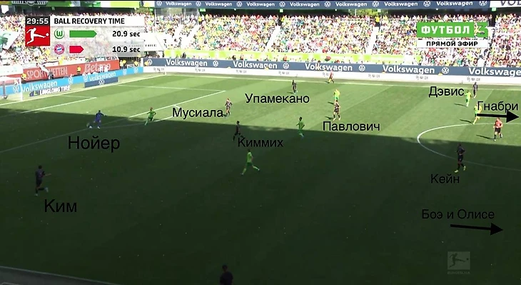 «Вольфсбург» нередко выстраивался шестеркой в оборонительной линии. Это и реакция на включения Боэ с Дэвисом, и страховка, чтобы защитники могли дергаться за Мусиалой и Кейном. В таком случае в оборонительной линии все равно оставалось четыре-пять человек – много. Нужно только успевать сужать коридоры.