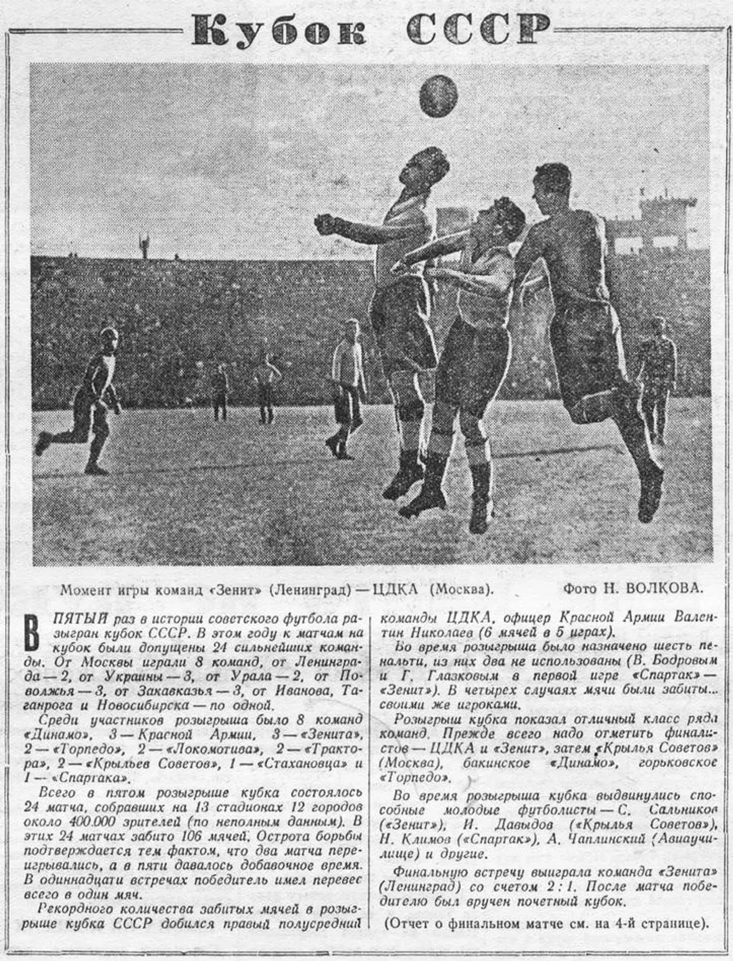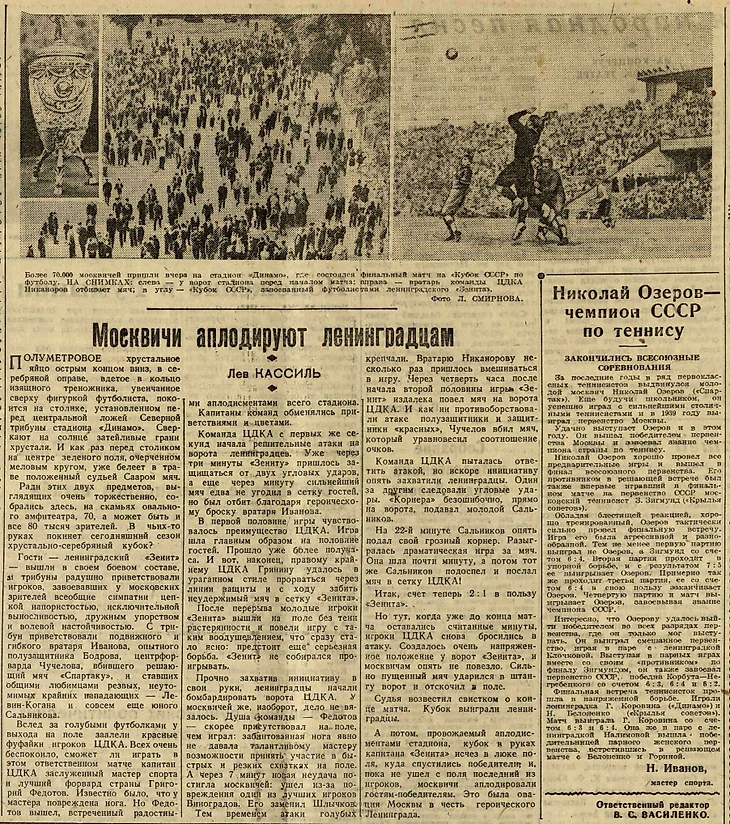 … провожаемый аплодисментами стадиона, кубок в руках капитана «Зенита» исчез в люке поля, куда спустились победители, и, пока не ушел с поля последний из игроков, москвичи аплодировали гостям-победителям. Это была овация Москвы в честь героического Ленинграда.