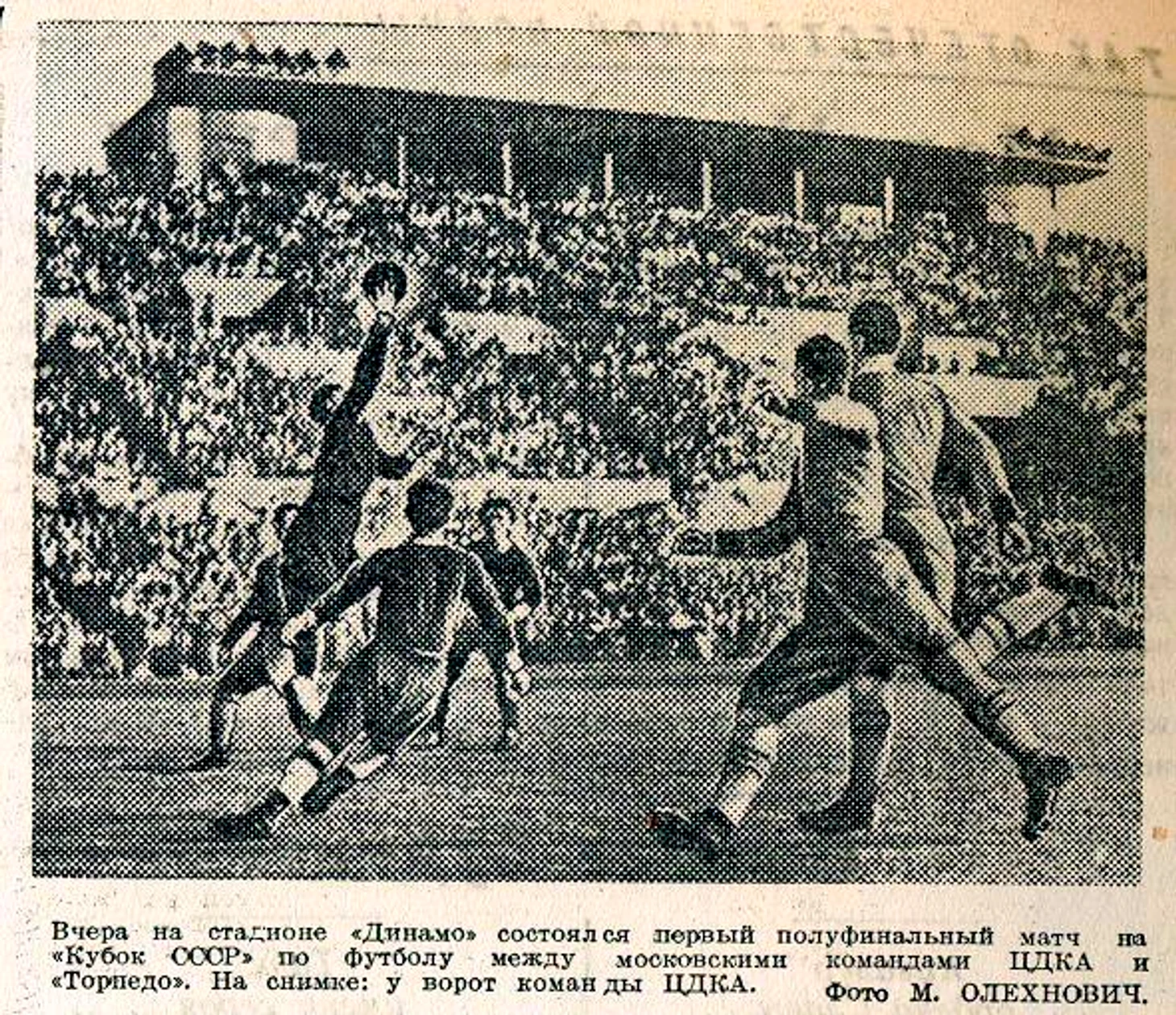 Итак, зрителей ждали полуфиналы ЦДКА – «Торпедо» и «Спартак» – «Зенит». Все три полуфинальных матча прошли в Москве, на «Динамо». Я не оговорился, именно три: первая встреча «Спартака» с «Зенитом» не выявила победителя, и на следующий день обе команды снова вышли на поле. Повторный матч, как и первый, выдался очень упорным – и чем ближе к концу, тем тяжелее становилось игрокам. Снова приведу воспоминание Иванова: