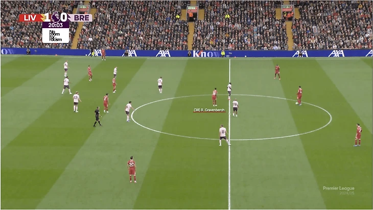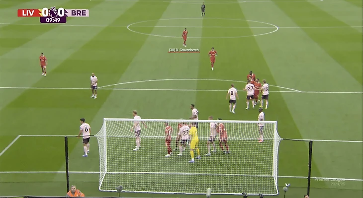 Это стартовая позиция Гравенберха с первого углового. Он — самый глубокий игрок, далеко позади Макалистера и Доминика Собослаи, и хорошо подготовлен к контратакам.