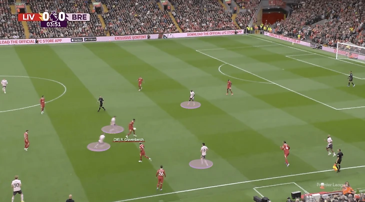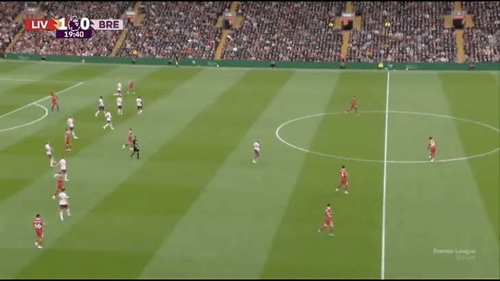 Он покачивает бедрами, уходя от соперников, как в этом моменте против «Брентфорда». На рисунке ниже показана позиция, которую он занял, чтобы получить мяч от Вирджила ван Дейка, между линиями. Когда он получает его, он может пойти в любую сторону и продолжить игру.