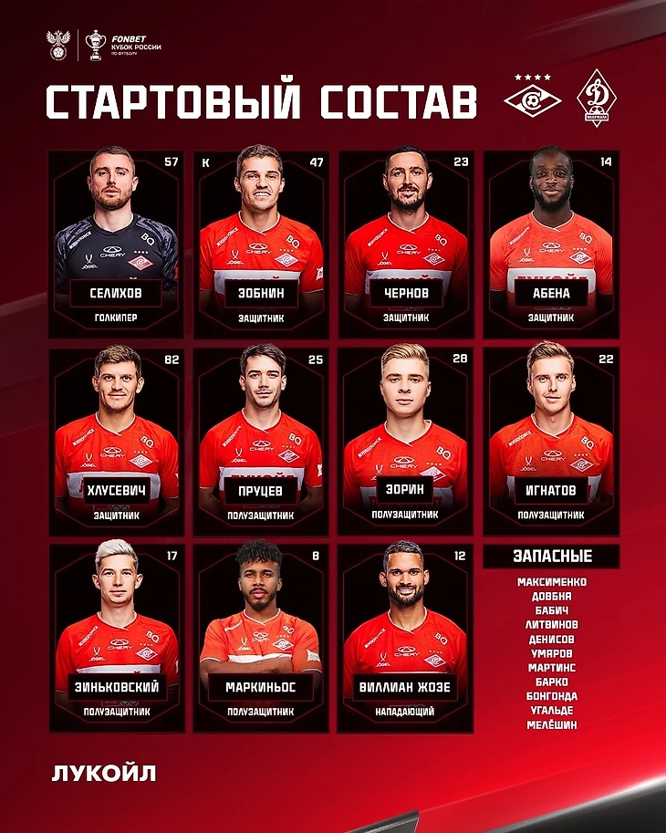 «Спартак»: Селихов, Зобнин (к), Хлусевич, Чернов, Абена, Пруцев, Зорин, Игнатов, Зиньковский, Виллиан Жозе, Маркиньос.