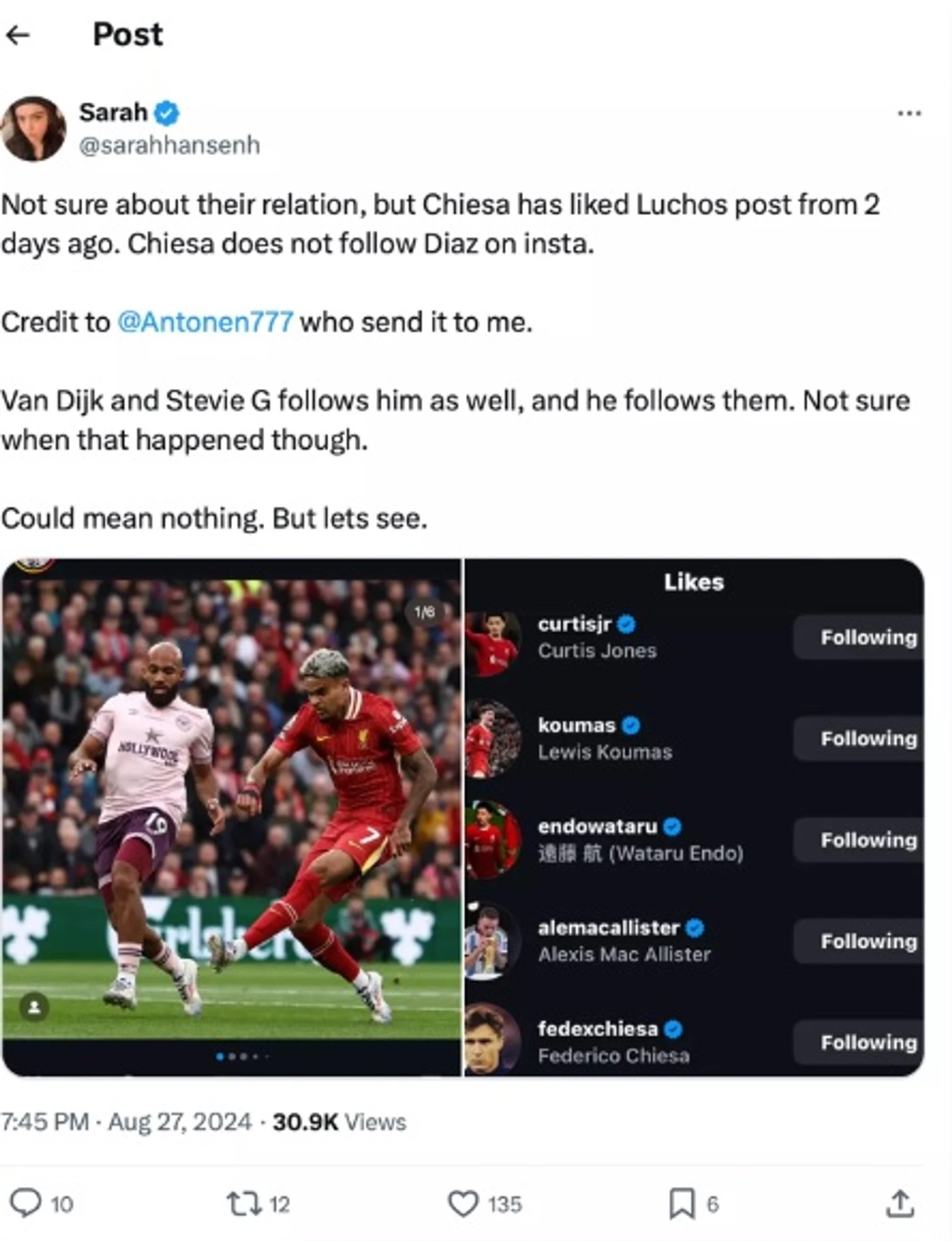 💭«Не уверен в их отношениях, но Кьеза лайкнул публикацию Лучо, сделанную 2 дня назад. Кьеза подписан на Диаса в инстаграме, а Ван Дейк и Стиви Джи подписались на Кьезу».