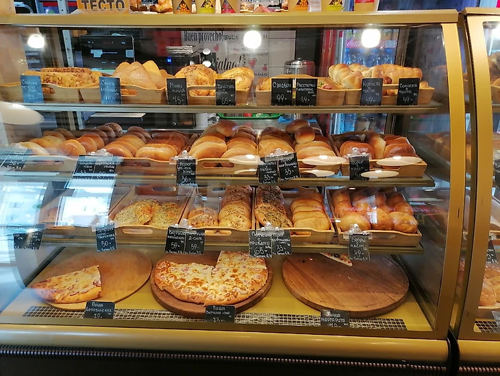 Больше в первом тайме голов не было. Самое время пройтись по поселку в поисках обеда и достопримечательностей. Сразу около стадиона Олимп находится пекарня. Взял два куска пиццы и морс, вышло двести двадцать рублей. Пицца для пекарни очень неплоха, советую🍕.