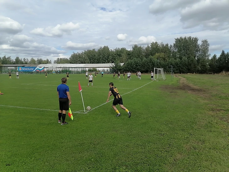 Приехал заранее, застал разминку перед игрой. Судя по баннеру, спонсирует футбол в поселке именно – эта ювелирная компания.