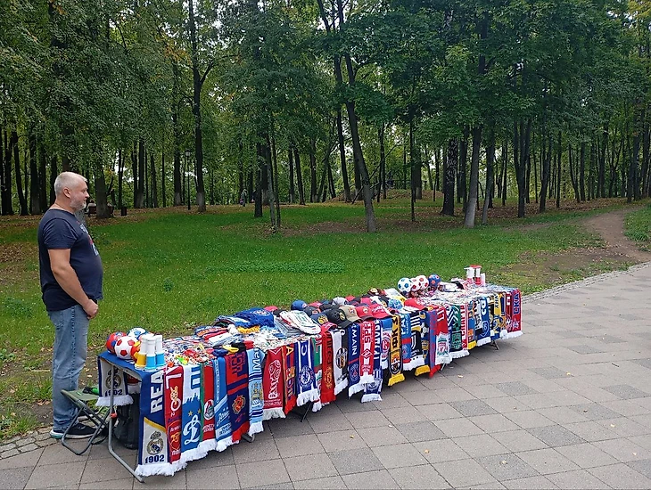 У стадиона в Раменском открыт только один вход – на Западной трибуне. Рядом два мужчины продают атрибутику. Спрашиваю, активно ли покупают.
