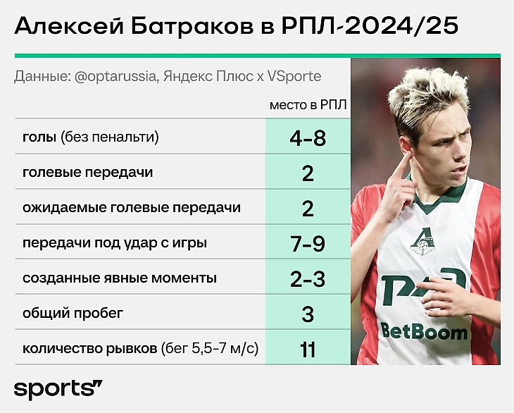 Весной Батраков отыграл три матча в старте – все в опорной зоне рядом с Бариновым. Сейчас Батраков сияет на месте десятки – да-да, именно там, где «Локо» так ждал усиления.